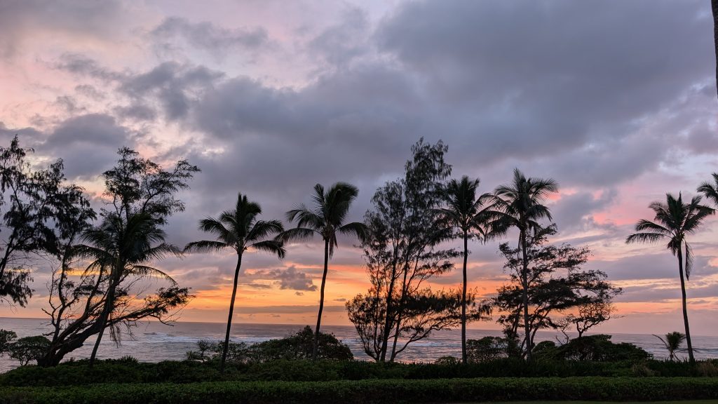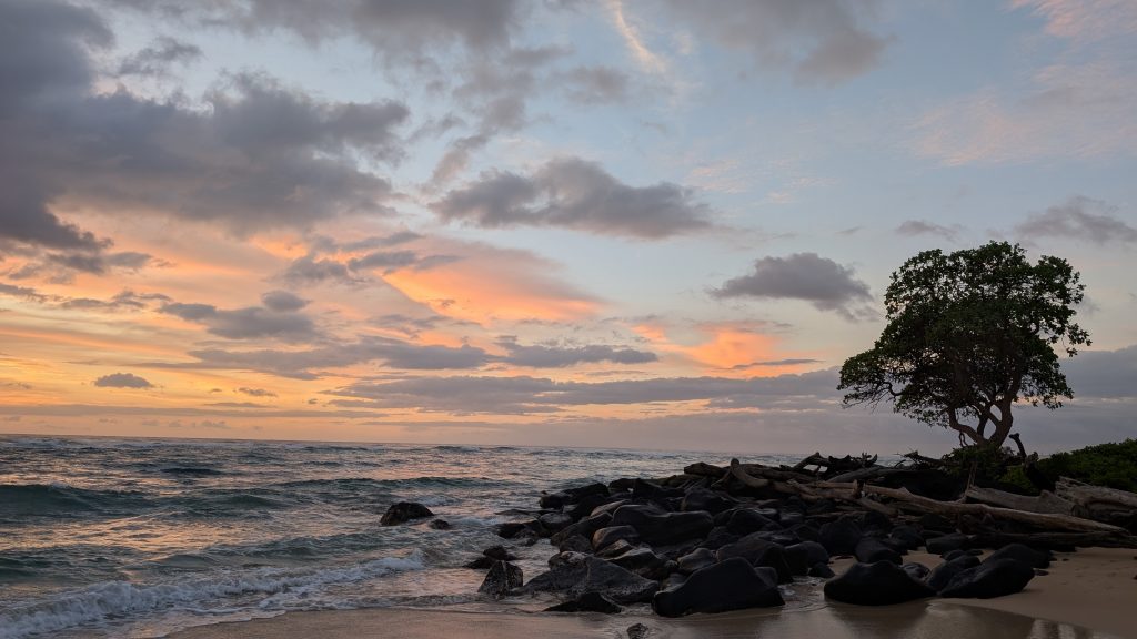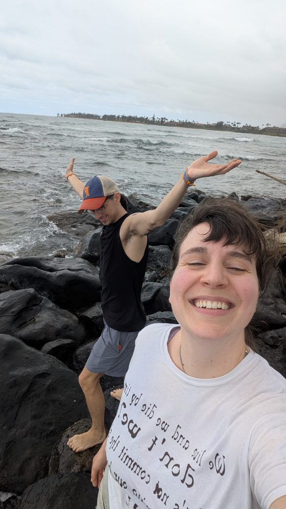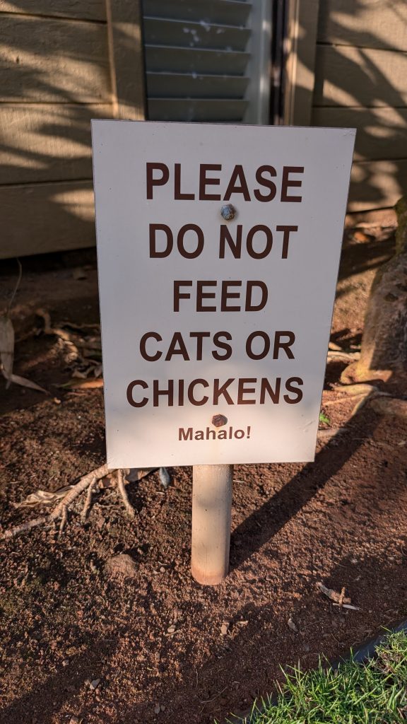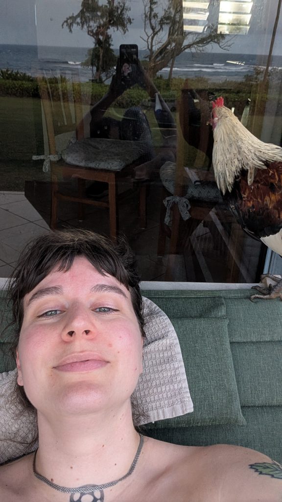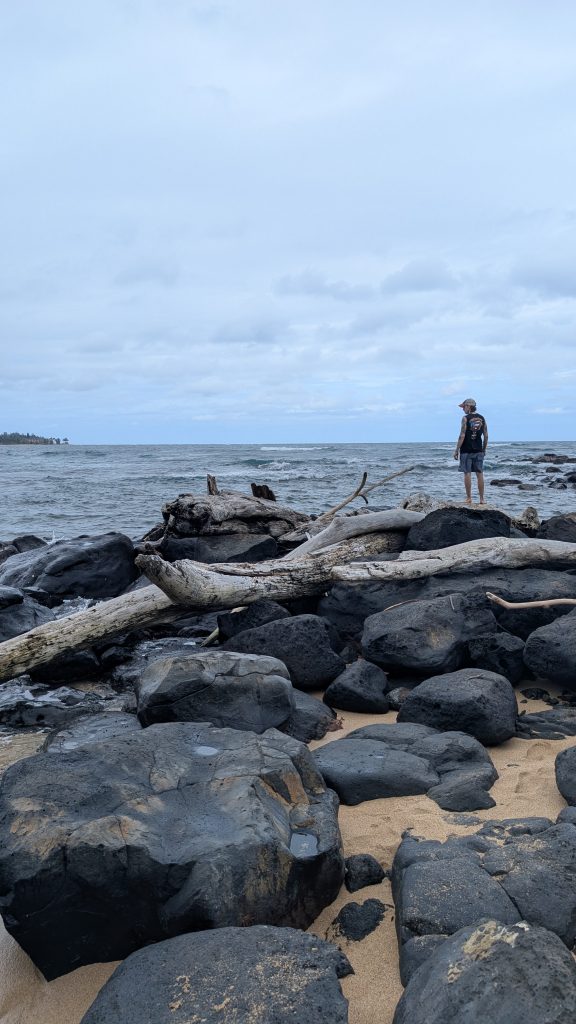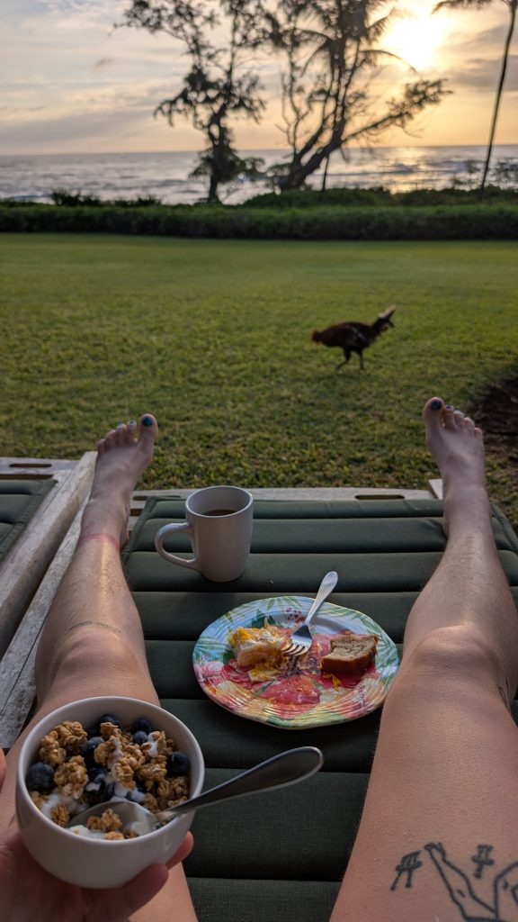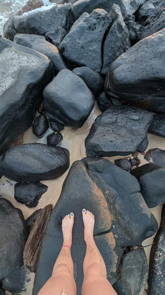 hot dogs or legs the volcanic rock is SO cool covered in barnacles got to see lots of skittering crabs. we’re staying in a little apartment very close to the water, it is unbelievable to wake up and look at the ocean RIGHT THERE. i learned that there are chickens EVERYWHERE!!!!! ON KAUAI!!!!! because of two hurricanes that happened in the late 80s and early 90s. a lot of coops got destroyed so loose domesticated chickens bred with wild red junglefowl and now their population has exploded because they don’t have any real predators. a lot of people see them as a nuisance but i think they are fun. they get really close to you and are not scared of anything and they walk all about with their babies. the only sad part is that the stray cats are afraid of the chickens!!!!