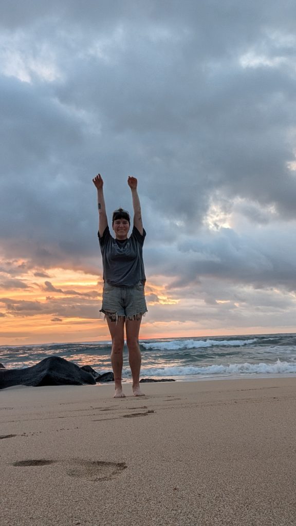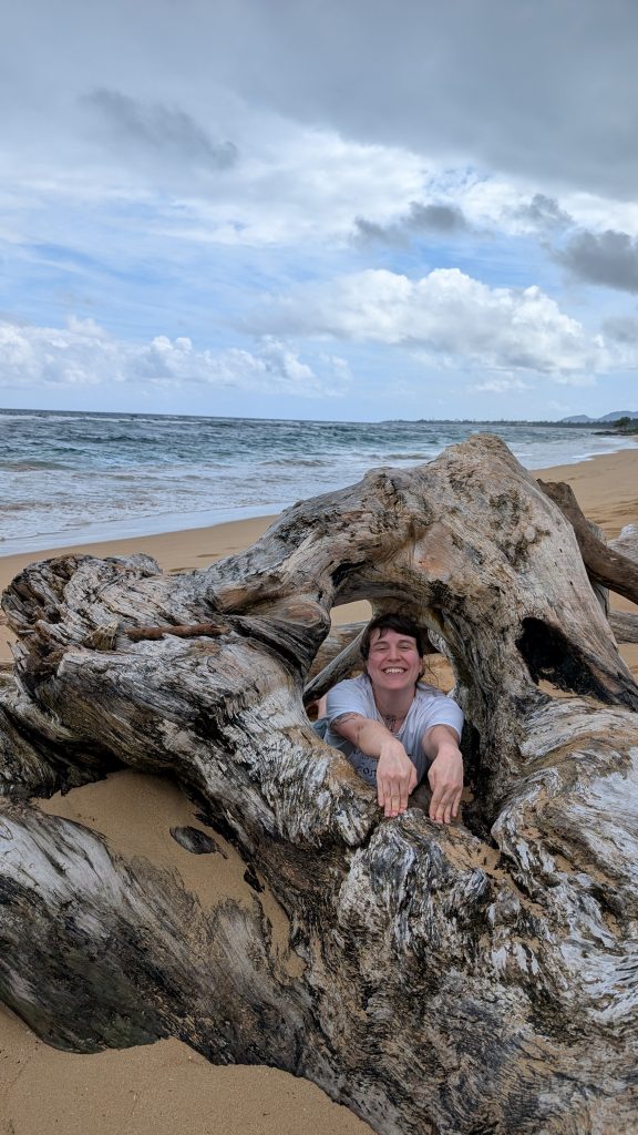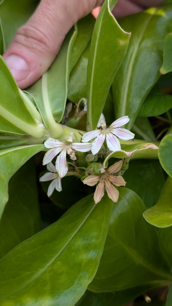 anyway. i have very much enjoyed the plants i’ve gotten to meet so far and the conversations with locals i’ve had about these plants! someone i met this morning told me that there are two kinds of naupaka (the plant with the little flowers above on the right) – coastal and mountain. they each have flowers whose petals are in a half circle, just on opposite sides of the stem. he said there’s a Hawaiian legend that Naupaka (a princess who lived in the mountains) had a forbidden romance with a poor fisherman (named Kaui). they were forced apart because of a big storm, so they tore a flower in half to represent their eternal forbidden love!! and that’s why the plants are like that.