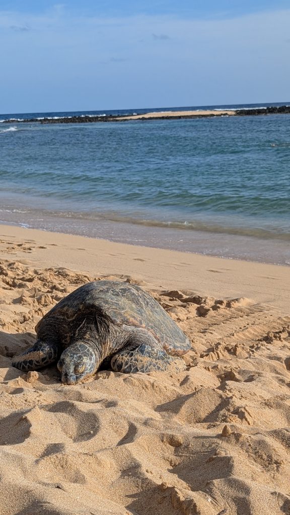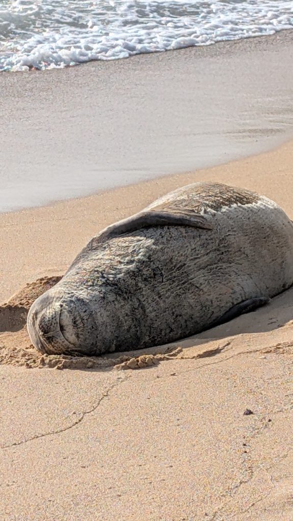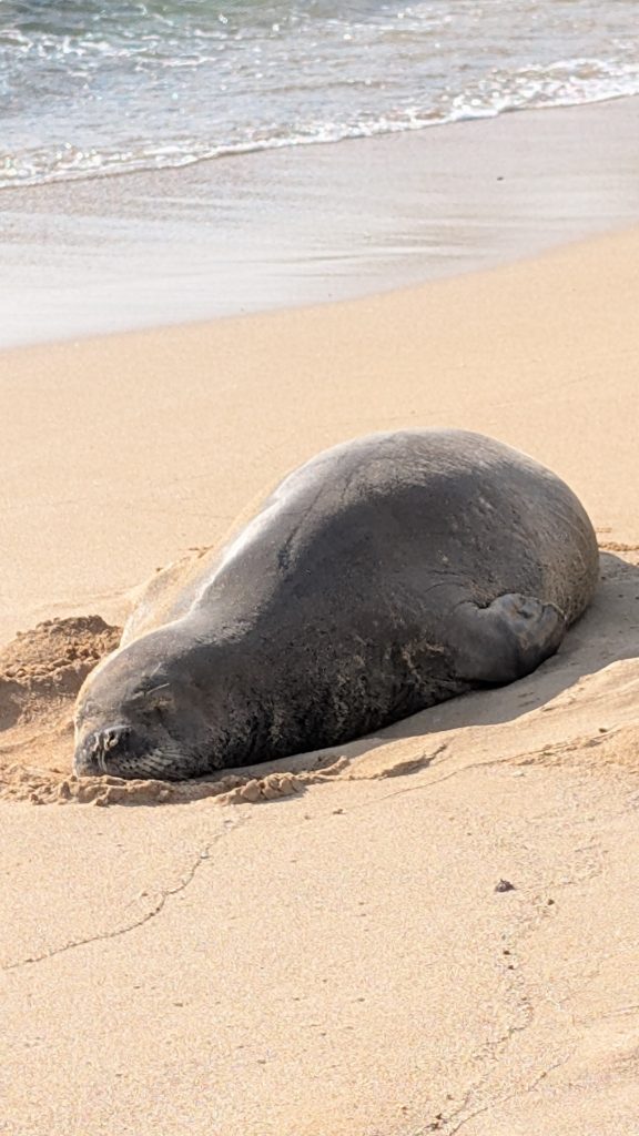 speaking of forbidden love, here are two kinds of animals we saw today that i wanted to kiss on the head sooooo bad. we went to Poipu beach and saw freaking wild monk seals (ʻīlio holo i ka uaua, which translates to “dog that runs in rough water”) and sea turtles (honu). sea turtles are believed by many native Hawaiians to be guardian spirits, called aumakua, who are mediators between the physical and spiritual worlds. i believe that!!!!! we got to see them sleeping on the beach and they looked so warm and calm and like they know everything there is to know. the monk seal we saw up close looked like a freaking puppy and was snoring so loud we could hear the honking from the many respectful feet away we were. when lil diva rolled onto his belly we gasped in delight.