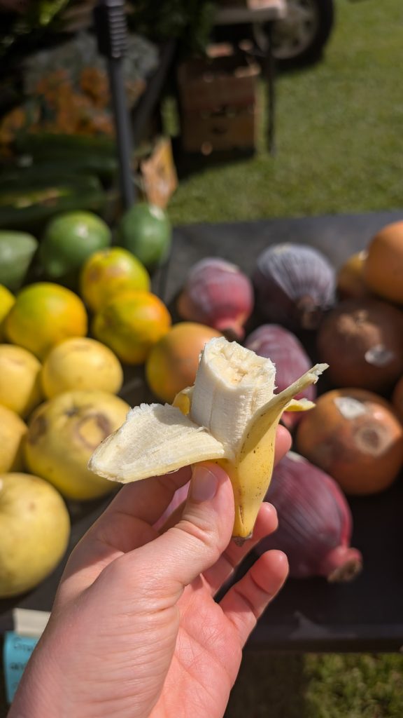 we bought tiny Thai ice cream bananas, cream apples, Kona oranges, durian!!!!, banana flowers, pomelos, special….. beans……???? yes. i loved it there.