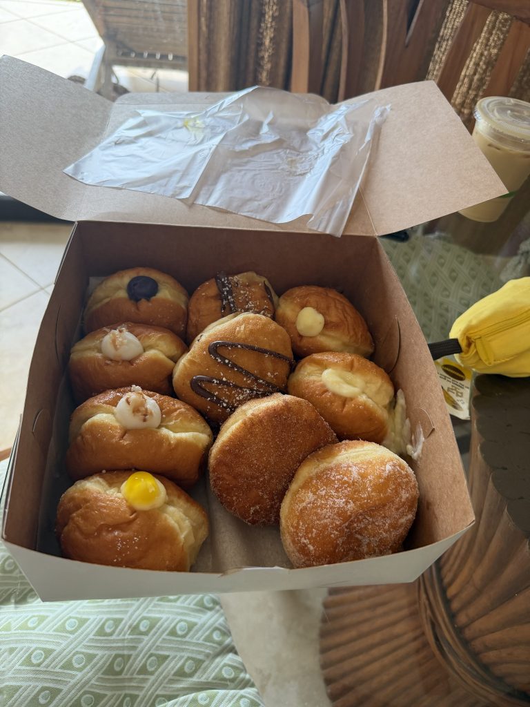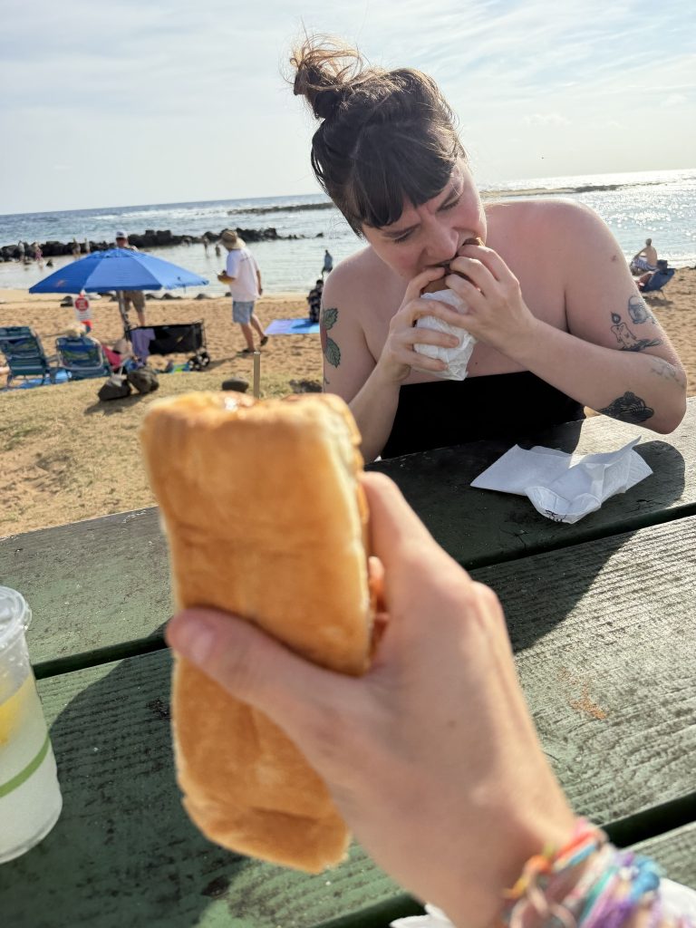 we also went to Kauai Bakery and got 10 million gorgeous malasadas which are Portuguese donuts that are really popular in Hawaii. other pic is one Abbot just sent of me eating the sweet hot dog yesterday. i did not know that i look like this while eating 🙂 i look like i am about to bite my own fingers.